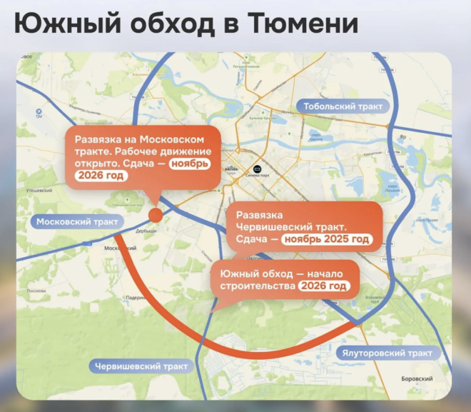 Южный обход Тюмени планируют построить с 2026 до 2029 года, проект реализует ГК "Автодор" после подписания соглашения между Минтрансом России и Тюменской областью. Финансирование предусмотрено из областного бюджета.
