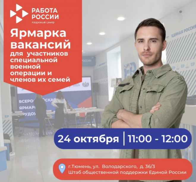 Отделение Кадрового центра "Работа России" по городу Тюмени и Тюменскому муниципальному округу 24 октября проводит ярмарку вакансий для участников специальной военной операции и членов их семей.