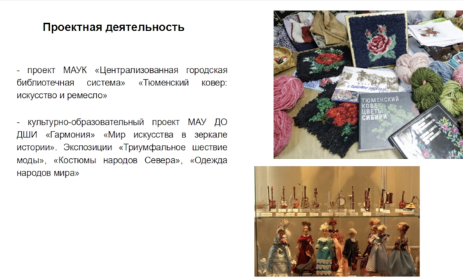 В Тюмени стало больше мероприятий и праздников с местных колоритом - мотивы тюменского ковра, деревянной резьбы и других ремесел легко считываются не только горожанами, но и гостями региона. Этому способствуют в том числе создание условий для развития местного традиционного народного художественного творчества, сохранение, возрождение и развитие народных художественных промыслов.