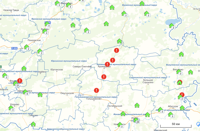 На реке Ишим проезда нет на двух мостах, из за этого отрезанными от "большй земли" в Абатском округе оказались село Назарово, деревни Черемшанка и Юрта, в Викуловоском - деревни Тюлешов Бор и Заборка.