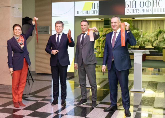 Проектный офис Президентского фонда культурных инициатив расположился на первом этаже Тюменской областной научной библиотеки имени Менделеева, церемонию открытия предварило подписание двух соглашений о сотрудничестве между правительством Тюменской области и фондом, между библиотекой и фондом.