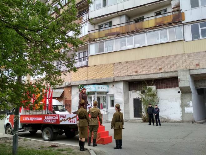 Песни военных лет исполнили артисты Центра русской культуры во дворе одного из домов по Заречному проезду для горожан и труженика тыла Василия Кронидовича Богданова.