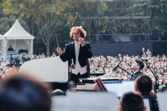 Оркестр играл 2 ноября на открытой площадке "Art Space" возле Шанхайского музыкального зала (Cadillac Shanghai Concert Hall) в окружении густо высаженных деревьев на фоне небоскребов. Открытая площадка вместила 1260 зрителей. Программа включала широко известные произведения как русских, так и китайских композиторов: Увертюру "1812 год" Петра Чайковского (солист – Фан Янь, фортепиано), "Половецкие пляски" из оперы "Князь Игорь" Александра Бородина, Концерт для фортепиано с оркестром "Желтая река" Инь Чэнцзуна, увертюру "Ода красному флагу" Люй Цимина. Два произведениякитайских композиторов являются знаковыми для культуры Поднебесной. Например, увертюру "Ода красному флагу" в Китае исполняют во многих торжественных церемониях. Произведение является символом страны.