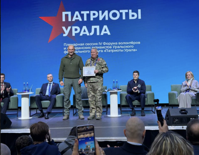 Полпред Президента России в УрФО Артём Жога во время подведения итогов работы IV форума "Патриоты Урала" наградил волонтеров и гражданских активистов федерального округа за их вклад в поддержку специальной военной операции, военнослужащих, выполняющих боевые задачи на передовой, и их близких, в числе награжденных - общественная организация "Ветераны пограничники Тюменской области",