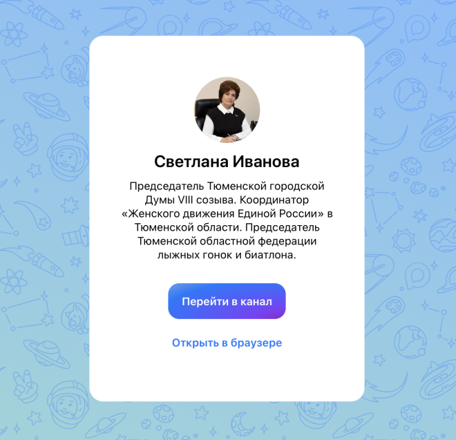 "Все больше тюменцев начинают пользоваться новым мессенджером. Чтобы оставаться с вами на связи и регулярно рассказывать о своей работе в качестве Председателя Тюменской городской Думы VIII созыва, координатора "Женского движения Единой России" в Тюменской области, Председателя Тюменской областной федерации лыжных гонок и биатлона, я завела свой канал в МАХ. Присоединяйтесь!" – обратилась к тюменцам Светлана Иванова.