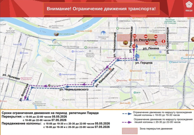 Ррепетиции парада, посвященного Дню Победы в Великой Отечественной войне, пойдут в Тюмени 5 и 7 мая, с 18 до 22 часов в эти дни движение на улице Республики от Орджоникидзе до Челюскинцев и на улице Первомайская от Володарского до Ленина будет прекращено.